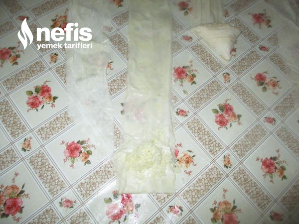 - Peynirli içi yufkanın üç kısmına koyalım çevirerek saralım.