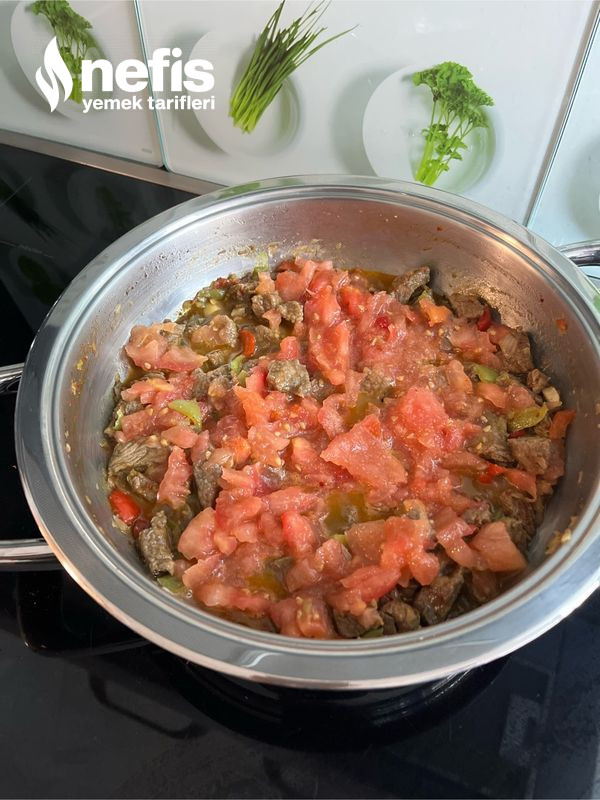 - En son domatesleri üzerine ekleyip etin üzerine yayın ( karıştırmayın !!) Domateslere hafif tuz serpin.