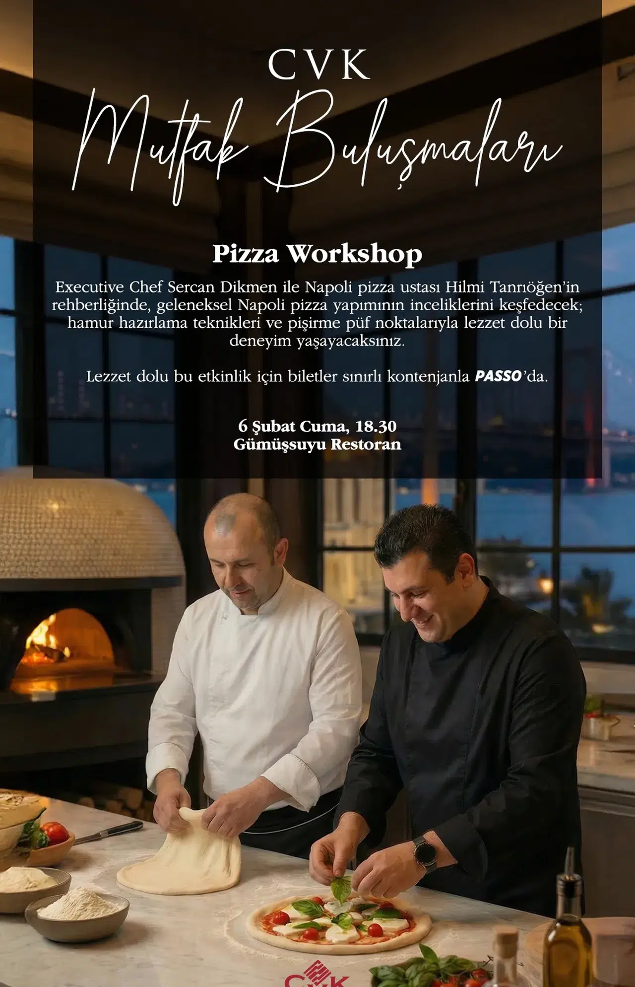 CVK Hotels & Resorts Grubu’nun lüks segmentteki amiral gemisi olan CVK Park Bosphorus Hotel İstanbul, gastronomi tutkunlarına hitap eden yeni etkinlik serisi "CVK Mutfak Buluşmaları" ile dikkat çekmeye hazırlanmaktadır. Bu etkinlik serisinin ilki, 6 Şubat Cuma günü Gümüşsuyu Restoran'da gerçekleşecek olan “Napoli Pizza Workshop” adıyla düzenlenecek. Etkinliğin yönetimini, CVK Park Bosphorus Hotel'in Executive Chef’i Sercan Dikmen ile Napoli pizza ustası Hilmi Tanrıöğen üstlenecek.