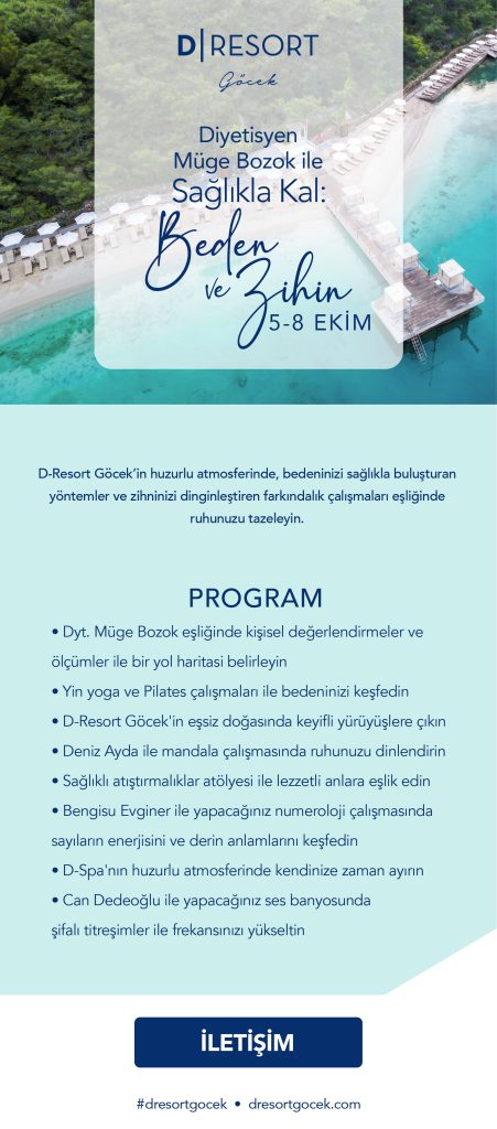 D-Resort Göcek, Diyetisyen Müge Bozok ile artık geleneksel hale gelen ve yoğun ilgiyle karşılaşılan ‘Recharge Yourself/Sağlıkla Kal: Beden & Zihin’ kampının bir yenisini 5-8 Ekim tarihleri arasında gerçekleştiriyor.