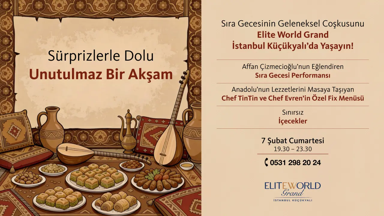 Elite World Grand İstanbul Küçükyalı, kültürel zenginliğimizin ve geleneklerimizin en güzel örneklerinden biri olan Sıra Gecesi etkinliğine ev sahipliği yapıyor. 7 Şubat Cumartesi akşamı 19.30 ile 23.30 saatleri arasında gerçekleştirilecek bu özel etkinlikte, müzik, lezzet ve Anadolu'nun zengin kültürel mirası bir araya getirilerek, katılımcılara sıcak bir ambiyans sunulacak.