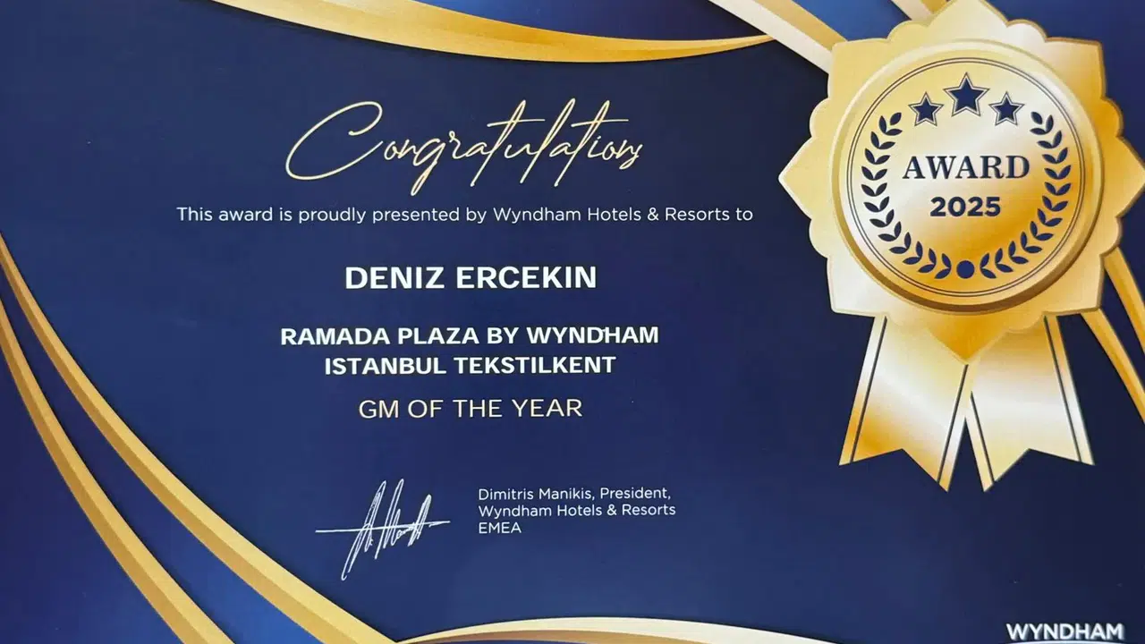 Konaklama sektörünün önde gelen isimlerini bir araya getiren Wyndham 2025 Executive Summit, katılımın yoğun olduğu bir etkinlik olarak düzenlendi. Bu zirvede, Ramada Plaza by Wyndham İstanbul Tekstilkent Oteli'nin Genel Müdürü Deniz Erçekin, Wyndham Hotels & Resorts tarafından verilen “2025 GM of the Year” (Yılın Genel Müdürü) ödülünün sahibi oldu.