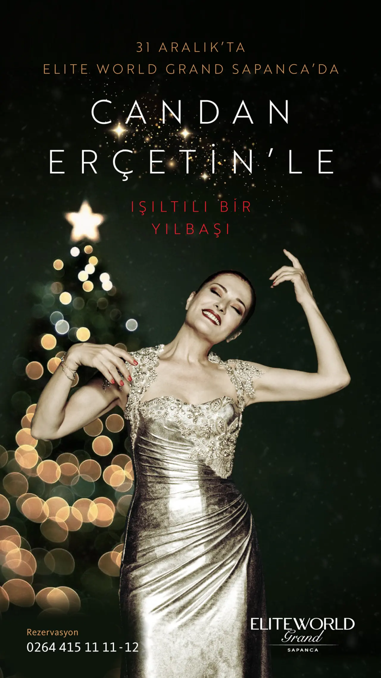 Elite World Grand Sapanca, muhteşem doğası eşliğinde Türk müziğinin sevilen sesi Candan Erçetin’i konuk ediyor. Misafirlere sunduğu özel menüler ve sürprizlerle dolu bir program, Sapanca'daki yeni yıl kutlamasını keyifli hale getirecek. Romantik bir atmosferde, huzurlu bir yılbaşı geçirmek isteyenler için bu mekan oldukça avantajlı bir tercih olacaktır. Candan Erçetin’in duygusal şarkıları, konukların yılbaşı gecesini daha da özel kılmak için sahne alacak.