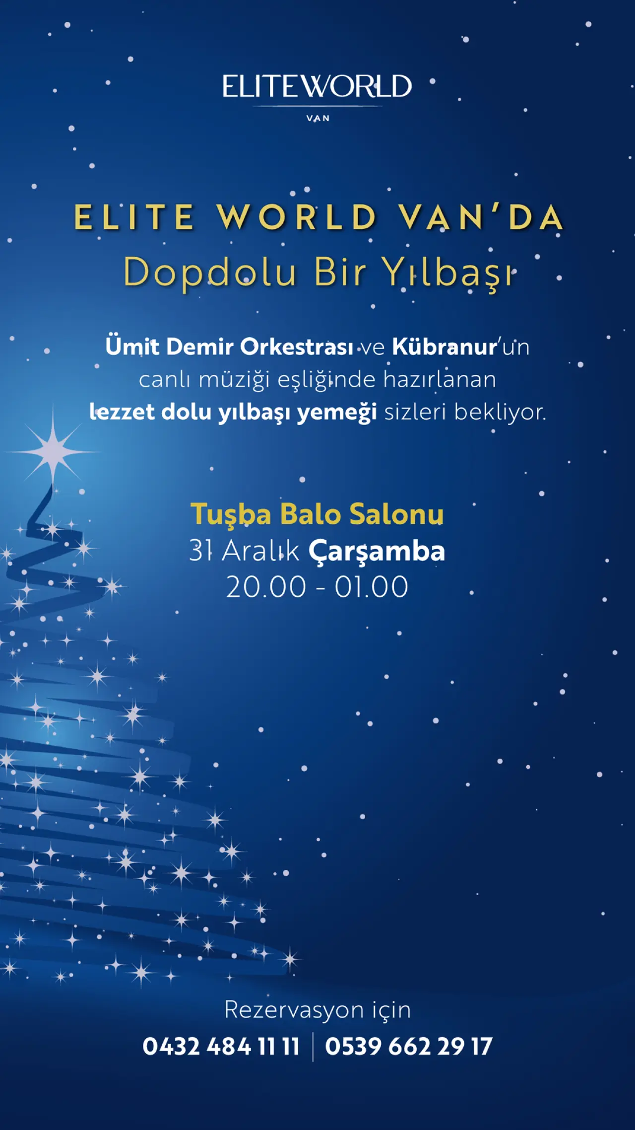 Elite World Van, yılbaşı gecesi Ümit Demir Orkestrası ve Kübranur’un enerjik canlı performanslarıyla dolu bir kutlama organize ediyor. The Grill Restoran’da sunulacak olan seçkin menüler eşliğinde misafirler, müziğin tadını çıkararak yeni yıla merhaba diyecekler. Van’daki bu kutlama, müzik ve eğlencenin bir araya geleceği benzersiz bir atmosfer sunuyor. Katılımcılar, bu unutulmaz gece boyunca hoş anılar biriktirecekler.